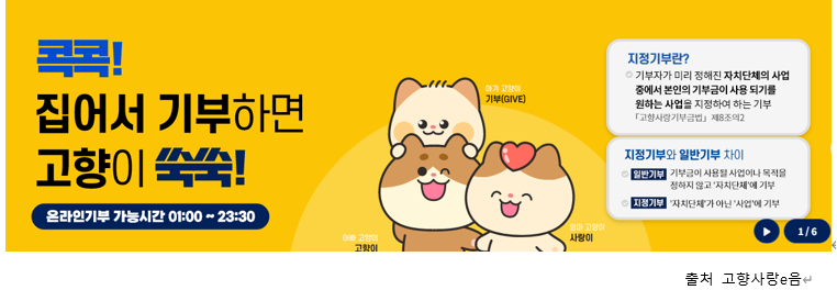 고향사랑e음은 단순한 기부를 넘어 고향과의 연결을 돕고, 지역사회와 기부자가 함께 발전하는 새로운 가능성을 열어갑니다. 지금 바로 고향사랑e음에 접속해 고향을 위한 따뜻한 나눔을 시작해 보세요!