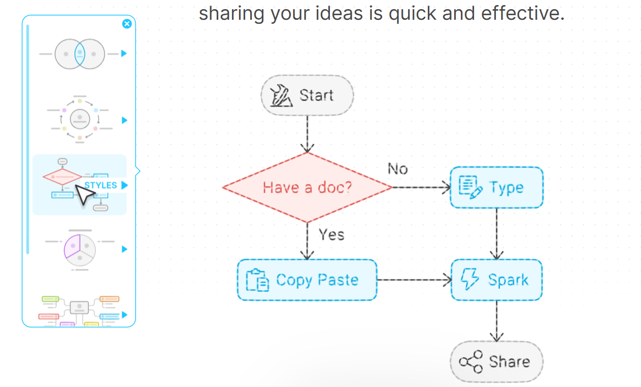 - 다양한 시각화 스타일 제공: 플로우차트, 마인드맵, 인포그래픽 등 다양한 형태의 시각화를 지원하여 사용자의 목적에 맞게 다이어그램을 구성할 수 있습니다.