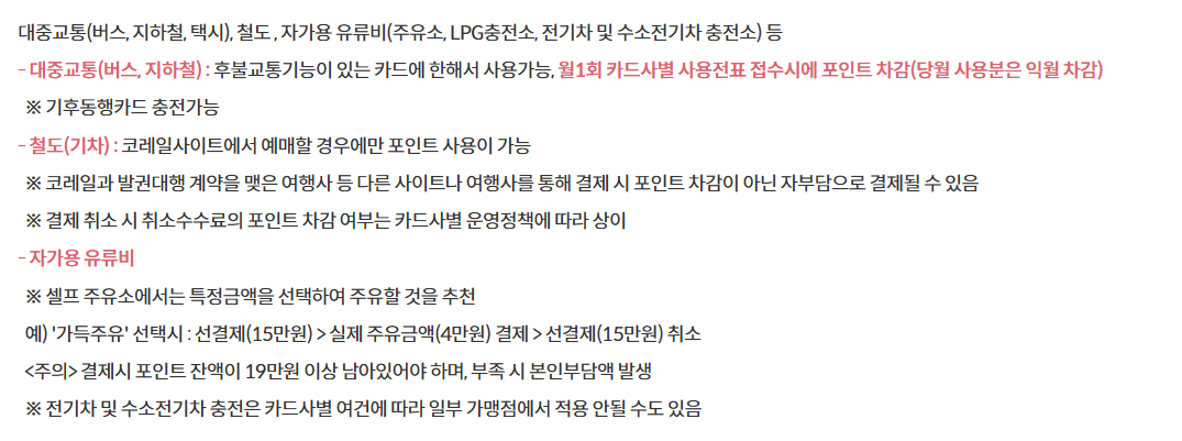 - 철도 이용 시: 코레일 공식 홈페이지에서 예매할 경우에만 포인트 사용이 가능합니다. 다른 사이트나 여행사를 통해 결제 시 포인트 사용이 제한될 수 있습니다.