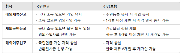 해외체류신고, 재외국민등록, 해외이주신고에 따라 국민연금과 건강보험의 적용 및 관리 방식이 달라집니다. 각 신고에 따른 차이를 상세히 설명하겠습니다.